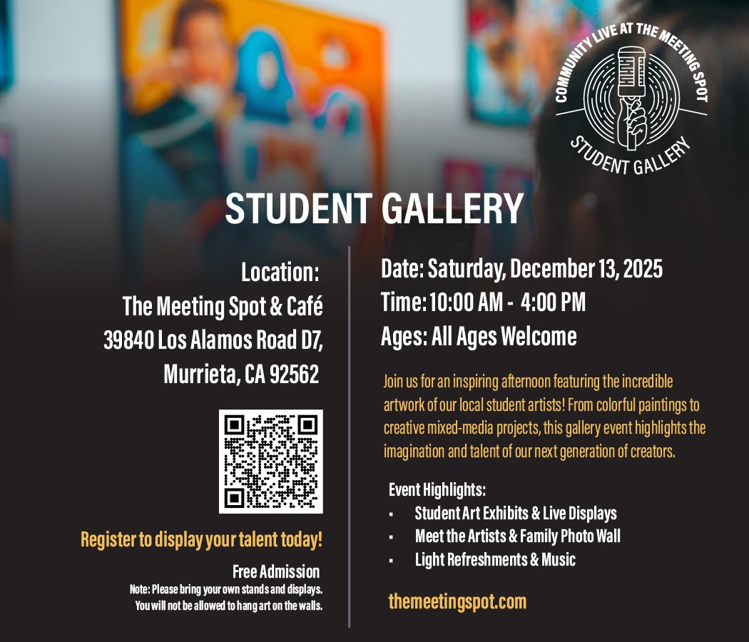 The Meeting Spot is Southwest Riverside County’s go-to hybrid café and meeting space designed for locals, professionals, creatives, and community groups. Located in the heart of Murrieta, just minutes from Temecula and Menifee, The Meeting Spot offers a refreshing alternative to traditional cafés and coworking spaces. We blend a cozy, high-quality café experience with flexible meeting rooms built for professionals, remote workers, creatives, students, and community organizers looking for a reliable space to connect and get things done.